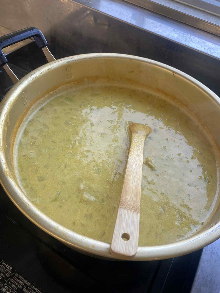 丁寧にとったエビのスープに、ココナッツミルクや炒めたたまねぎ・にんにく・鶏肉を入れていきます。