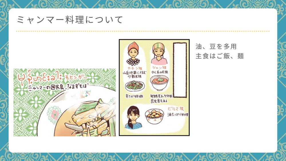「ミャンマーでご存じの料理はありますか?」と聞いたところ、「わからない…」と回答が。私自身も、ミャンマーの友人に教わるまで、ほとんどミャンマー料理について知りませんでした。