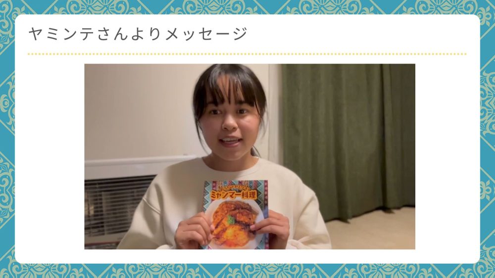 著者のヤミンテさんは大学に通いながらミャンマー料理を研究されています。本日はビデオメッセージでご参加くださいました!