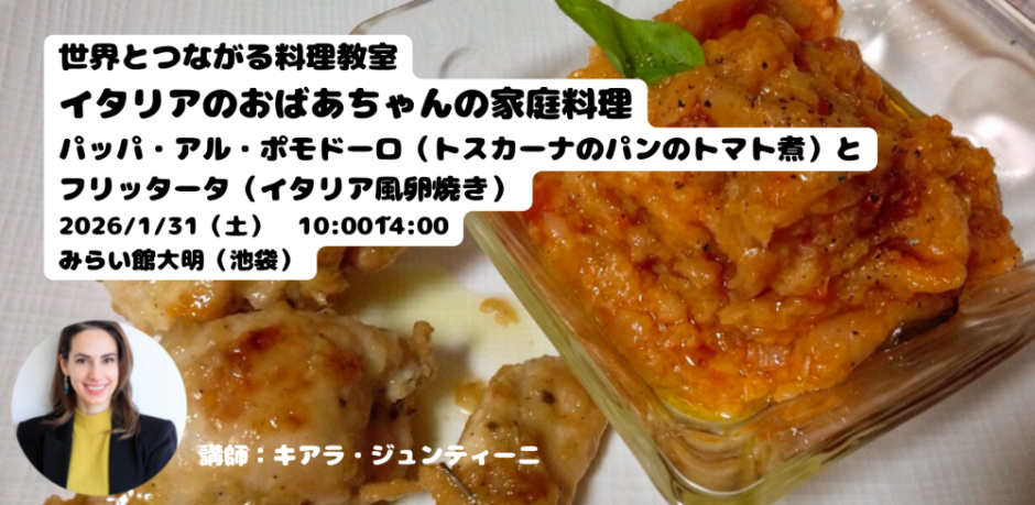 今回は、TBS「マツコの知らない世界」やNHK「BENTO EXPO」「しあわせ気分のイタリア語」で活躍される、イタリア人のキアラ・ジュンティーニさんを講師にお招きし、「イタリアのおばあちゃんの家庭料理」をお教えいただきます!